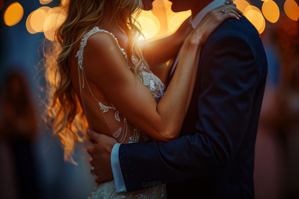 Nevesta a ženích v objatí zozadu: Nevesta stojí pred ženíchom, ktorý ju objíma zozadu. Táto póza vyjadruje ochranu a blízkosť.